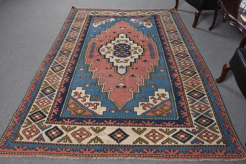 Pink & Blue Rug, 5,9x8,5 ft Geometric Floral Design