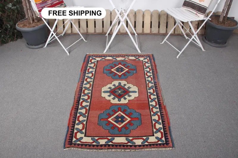 Pink and Blue Rug, 2,7x4,1 ft Bordered Design