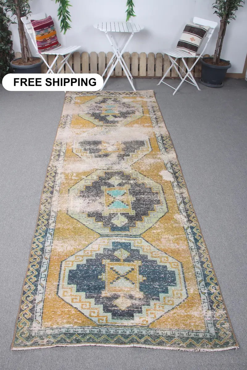 Yellow, Green Rug 3,5x9,8 ft, Geometric Floral Design