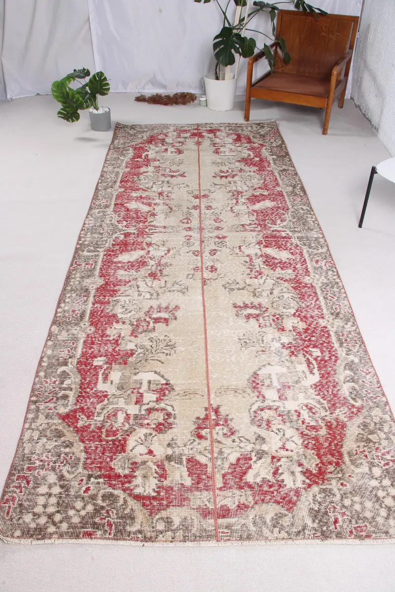 Elegant Beige & Red Rug, 4,1x10,5 ft Botanical Design