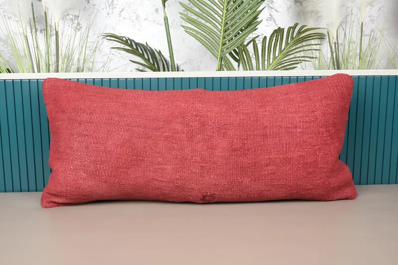 Red Southwestern Embroidered Throw Pillow, 16x36 Handmade Linen Pillow