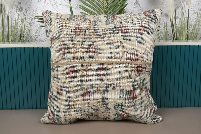 Embroidered Vintage Patchwork Throw Pillow, Handmade Beige & Red Cushion