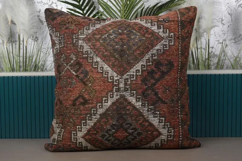 Red & Beige Southwestern Embroidered Pillow, 32x32 Handmade Throw Pillow