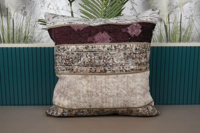 Beige & Brown Patchwork Throw Pillow, Handmade Embroidered Pillow