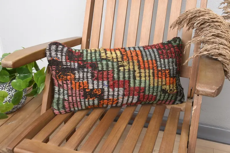 Geometric Green & Orange Embroidered Pillow, Vintage Rectangle Throw Pillow