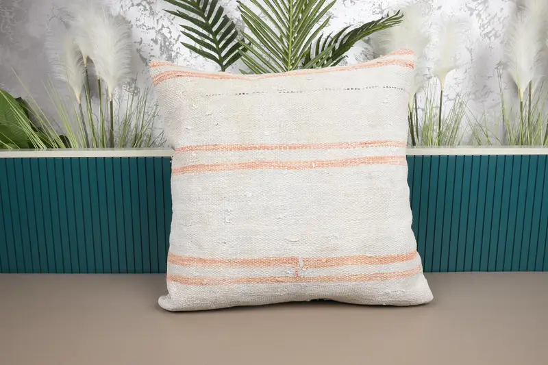 Beige & Orange Striped Throw Pillow, Handmade Embroidered Cushion
