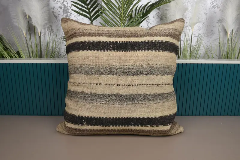 Beige & Brown Patchwork Throw Pillow, Embroidered Vintage Pillow