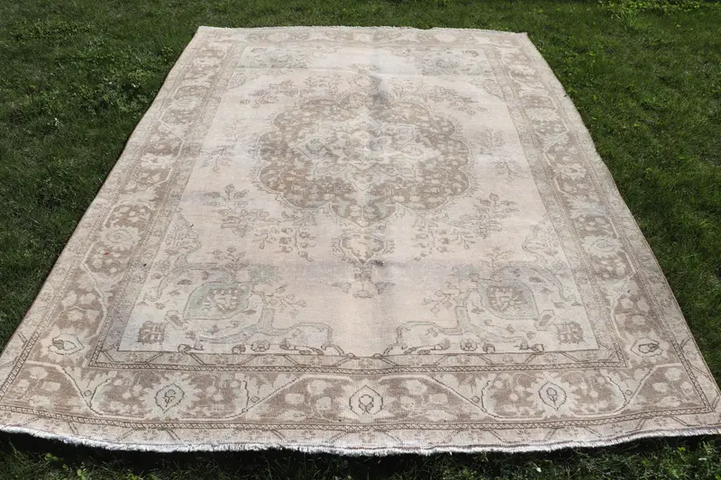 Brown Abstract Rug, 6.6x9.3 ft with Green Accents