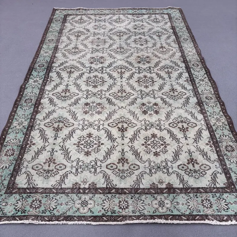 Elegant Green Rug with Geometric Floral Motifs, 5.9x9.6 ft