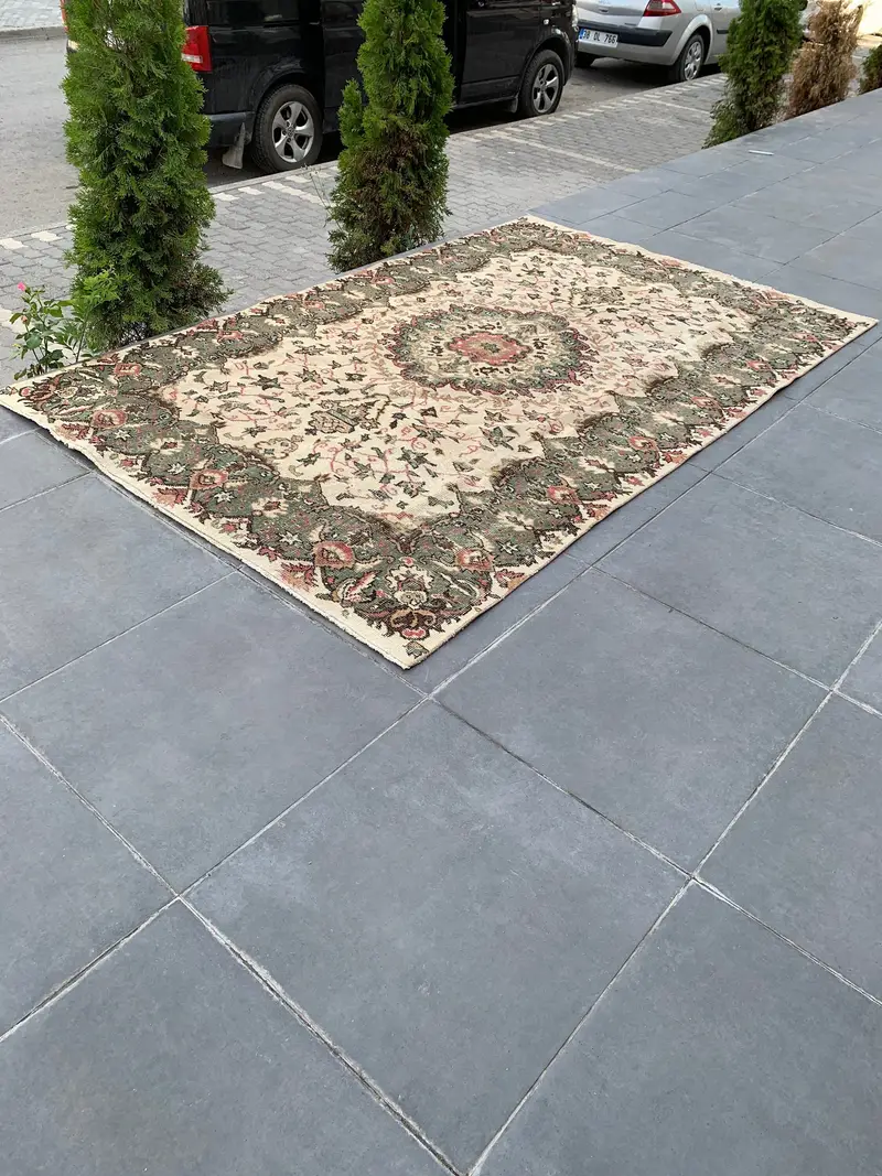 Elegant Beige Oriental Rug, 5.57x8.6 ft with Green Accents