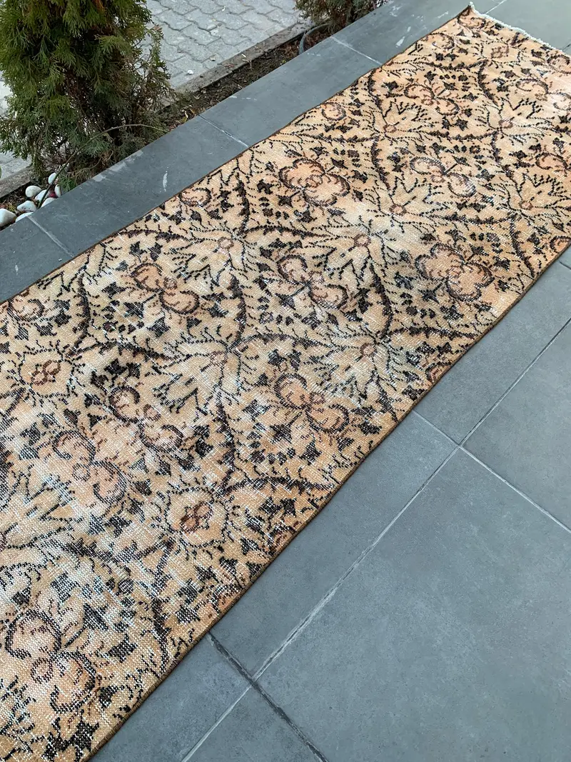 Orange & Brown Rug, 2.9x9 ft Geometric Floral Design