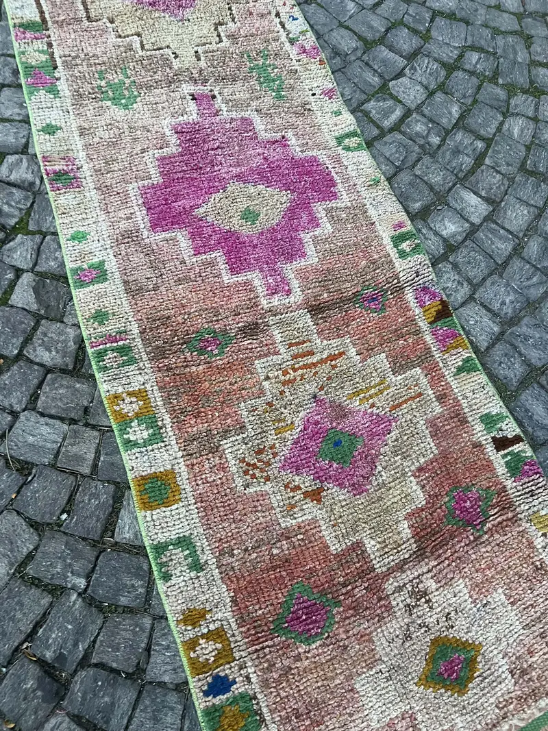 Elegant Pink Oriental Rug, 2,3x9 ft with Green Accents
