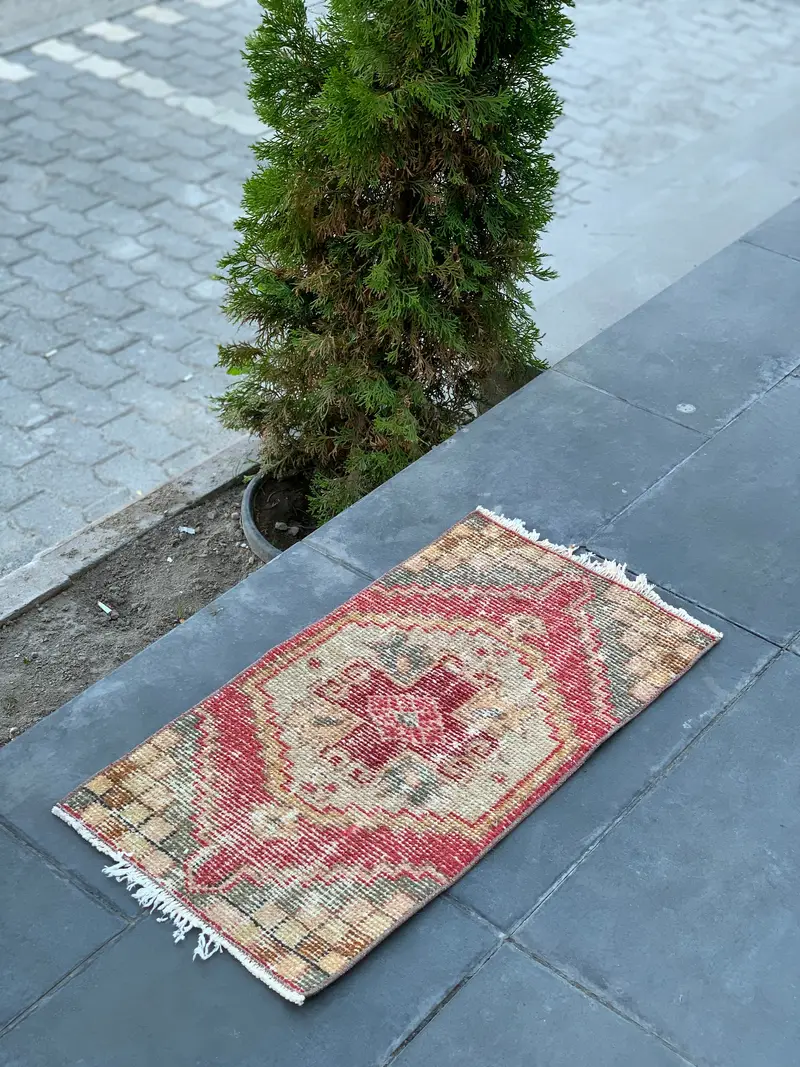 Elegant Beige Oriental Rug, 1.3x2.4 ft with Red Accents