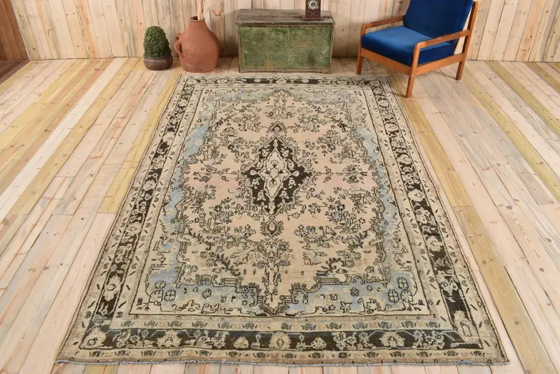 Elegant Beige & Blue Rug, 6.4x10 ft Polka Dot Design
