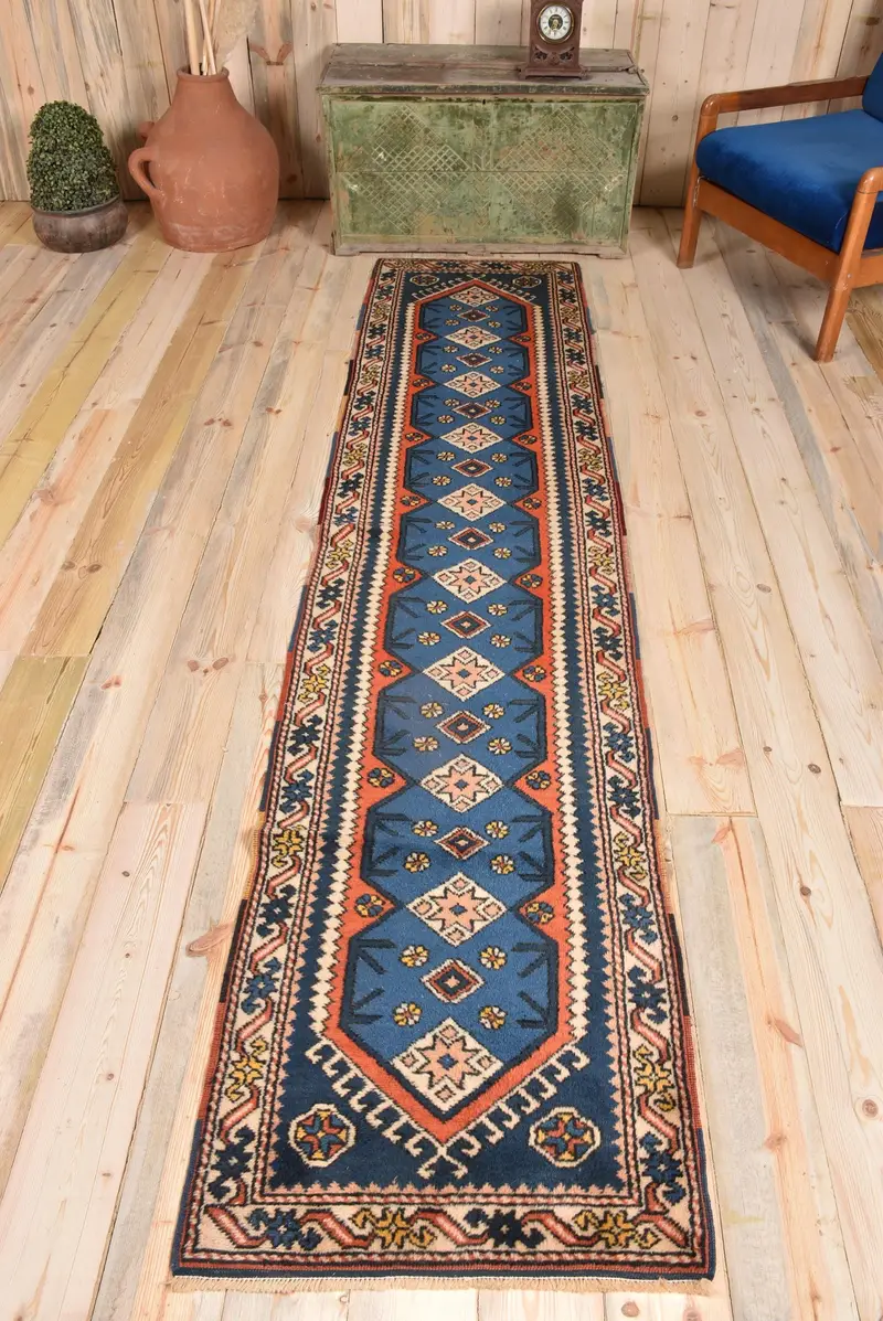 Blue Southwestern Rug, 2,1x9,1 ft with Orange Accents