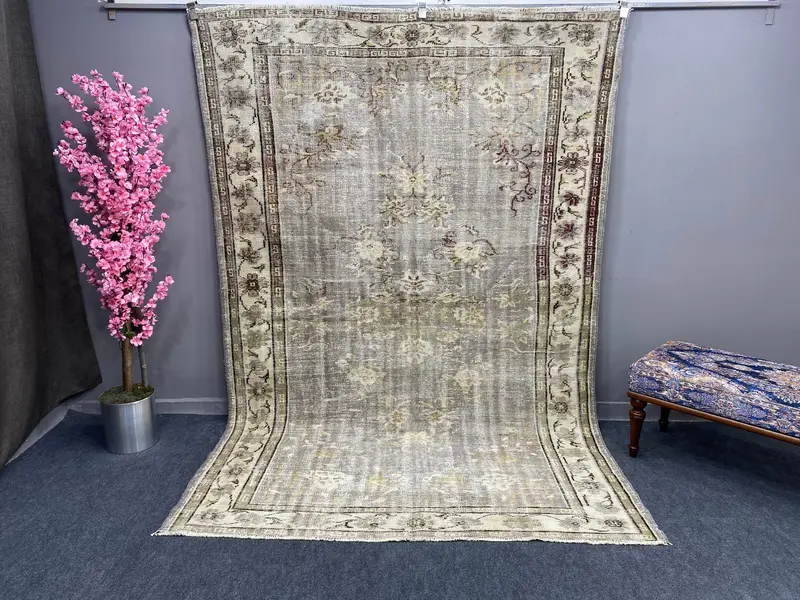 Gray Geometric Rug, 6.3x9.1 ft with Floral Motifs