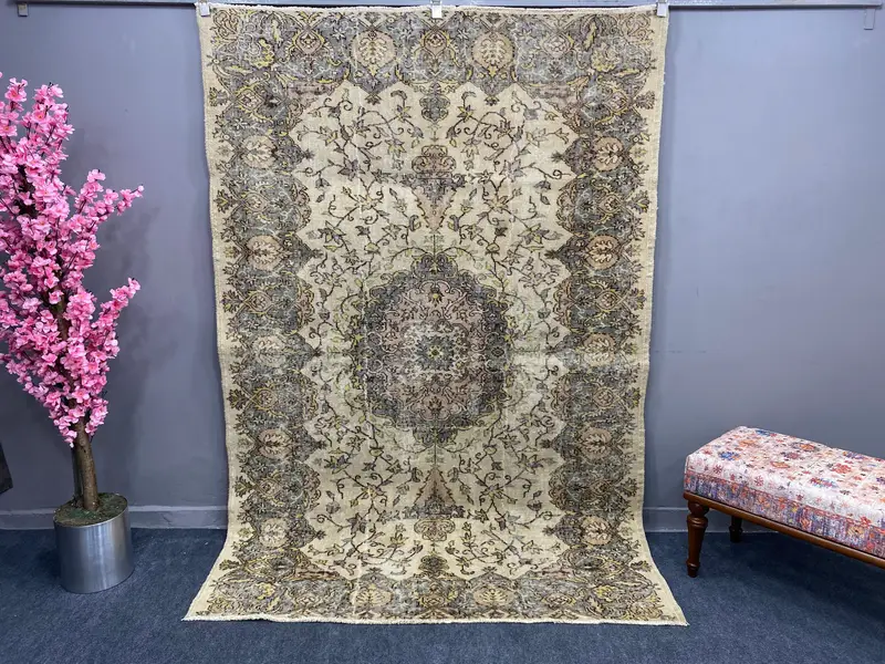 5.3x8 ft Gray Oriental Rug, Elegant Yellow Accents