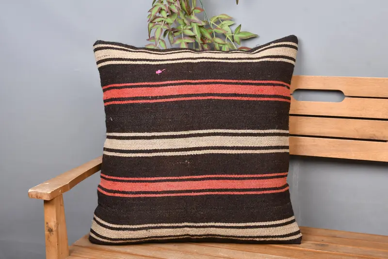 Handmade Brown and Red Striped Throw Pillow, Vintage Embroidered Cushion