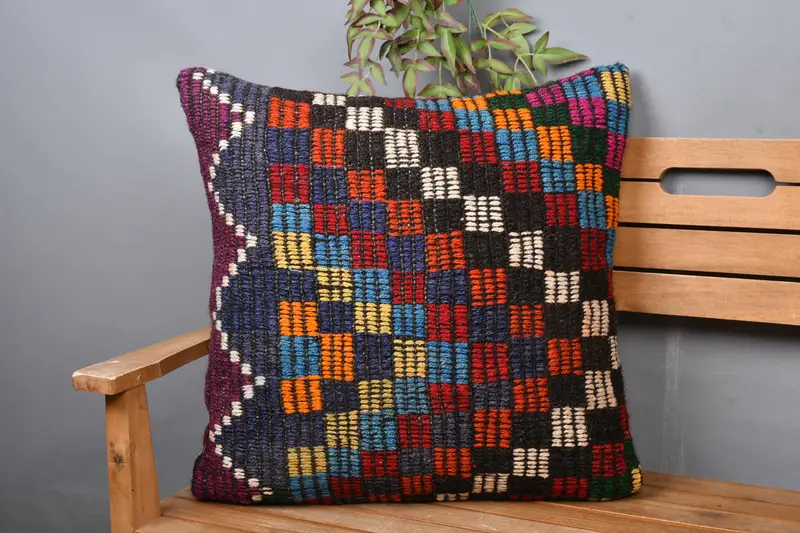 Embroidered Blue & Red Geometric Throw Pillow, Vintage Handmade Cushion
