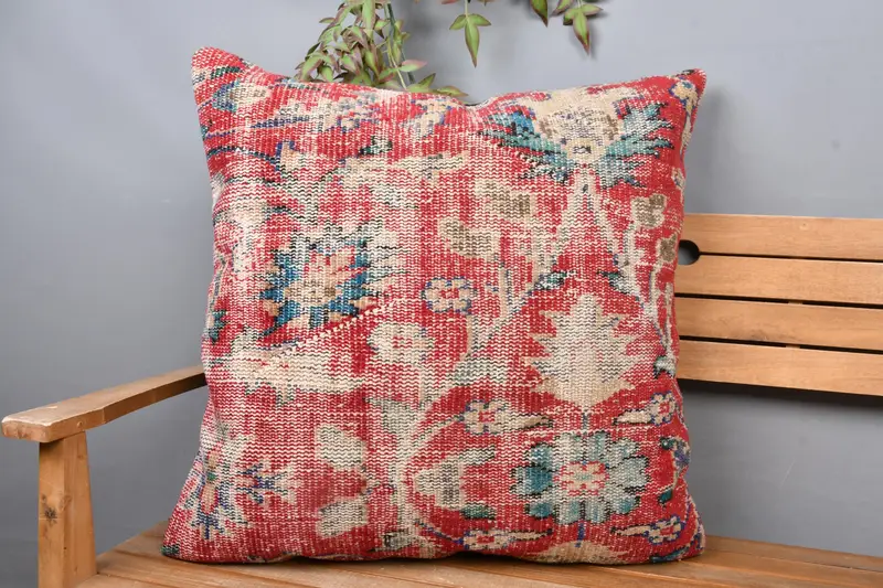 Red Linen Throw Pillow with Bronze Floral Embroidery, Vintage Cushion