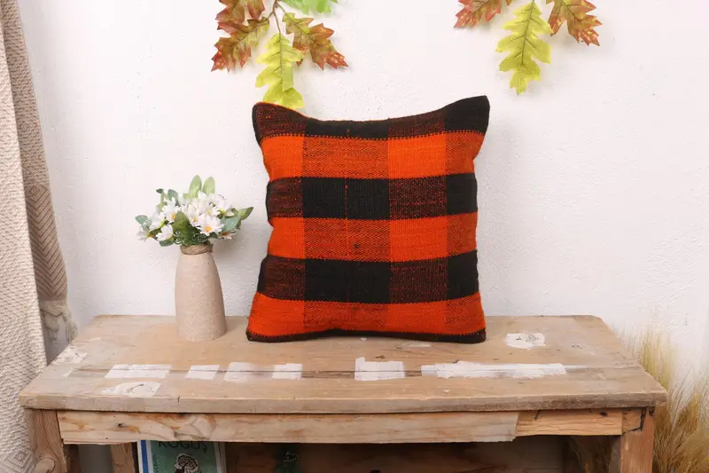 Handmade Brown & Orange Striped Throw Pillow, Vintage Embroidered Cushion