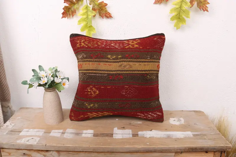 Red & Brown Geometric Linen Throw Pillow, Vintage Embroidered Cushion