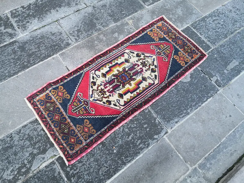 Red Oriental Rug, 1,83x4,42 ft with Blue Accents
