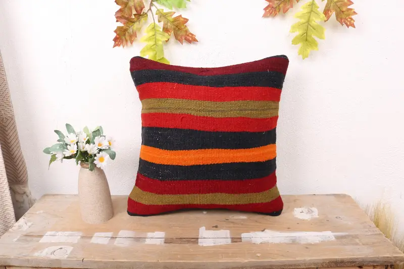 Orange & Brown Striped Throw Pillow, Handmade Embroidered Cushion