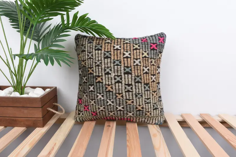 Embroidered Beige & Orange Throw Pillow, Handmade Geometric Cushion