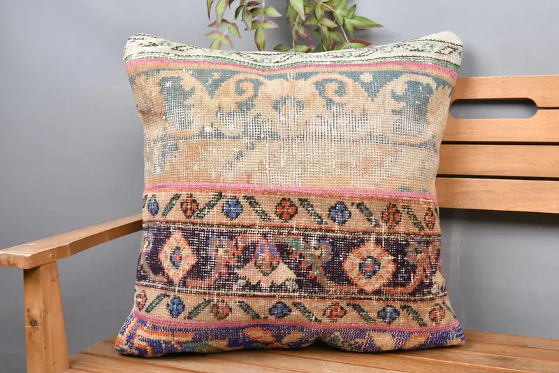 Blue & Gray Patchwork Throw Pillow, Handmade Embroidered Cushion