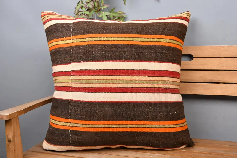 Embroidered Brown & Beige Striped Pillow, 28x28 Handmade Throw Pillow