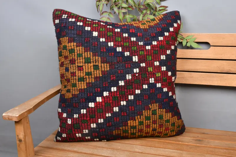 Blue & Red Embroidered Kilim Cushion, 24x24 Vintage Throw Pillow