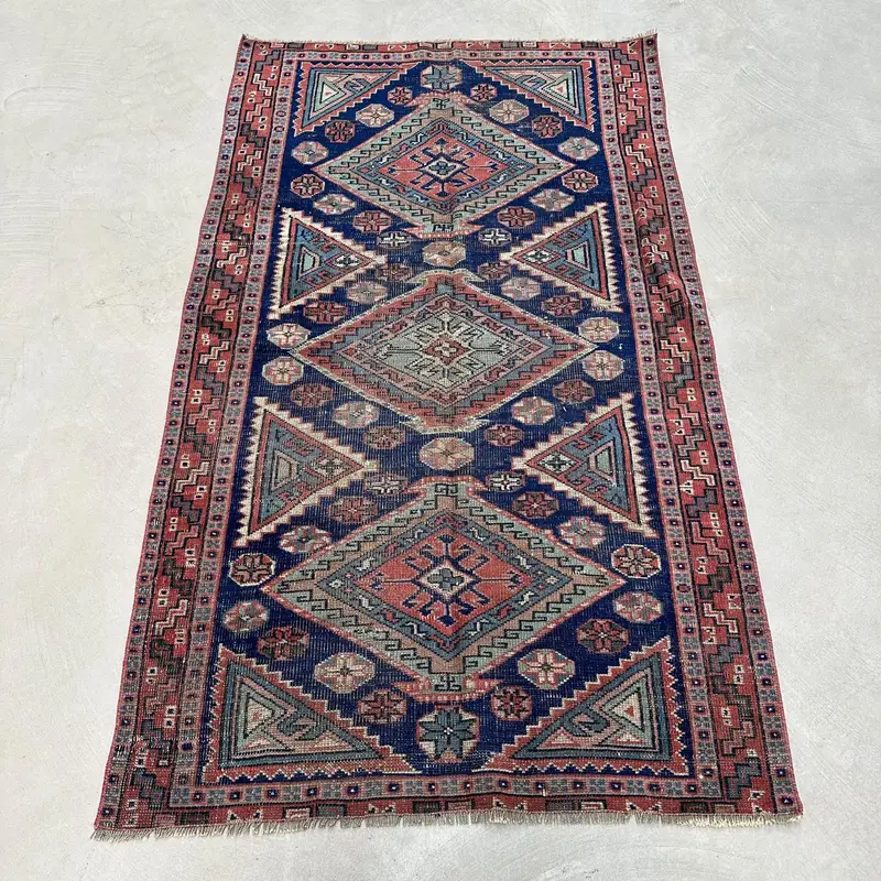 Blue Geometric Rug with Red Floral Motifs, 2.9x4.9 ft