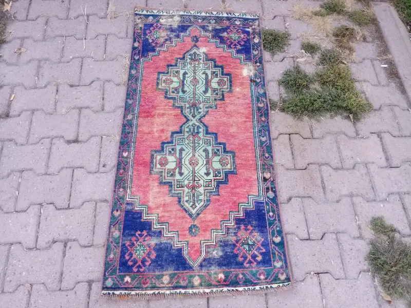 Pink Oriental Rug, 2,08x4,42 ft with Blue Accents