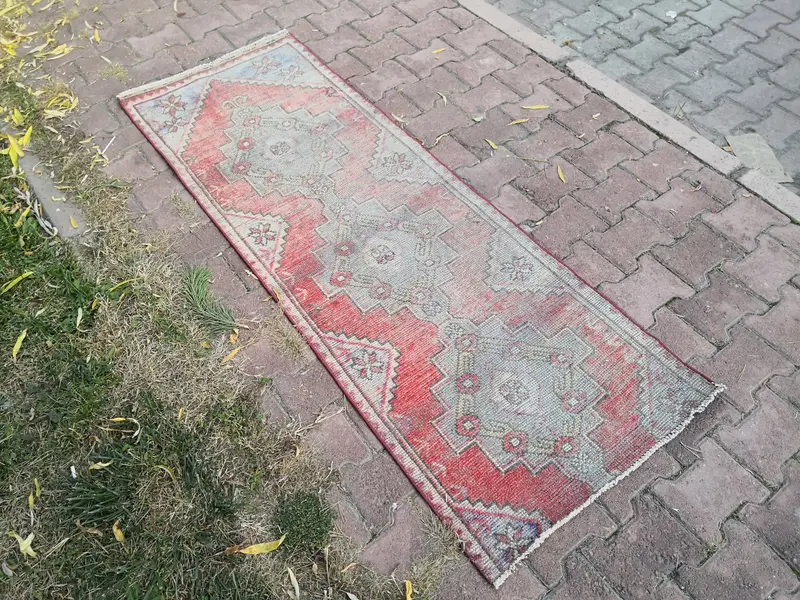 Red Oriental Rug, 2,17x6,17 ft Elegant Gray Accents