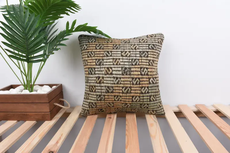 Handmade Embroidered Orange & Beige Throw Pillow, Vintage Cushion