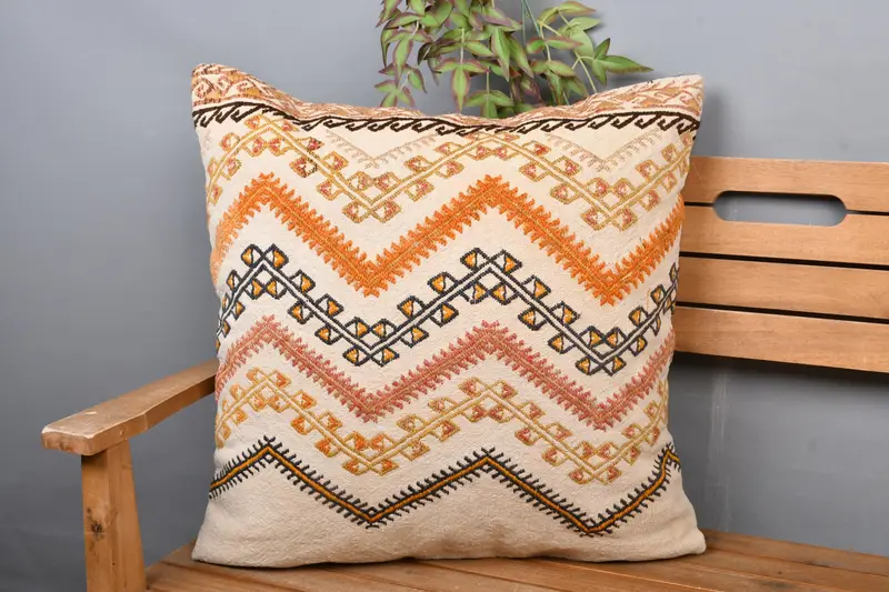 Brown & Beige Embroidered Throw Pillow, Vintage Handmade Cushion