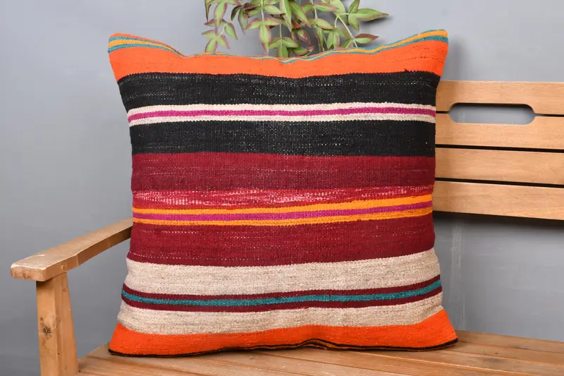 Red & Brown Striped Throw Pillow, Handmade Embroidered Linen Pillow
