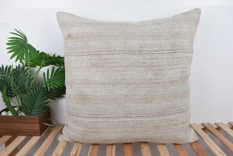 Experience the warmth and timeless charm of our beige striped throw pillow, meticulously crafted with vintage embroidery. The pillow features a harmonious blend of beige hues, creating a soothing and elegant aesthetic that complements any decor. Its square shape and 32x32 inch dimensions make it a versatile addition to your living room, game room, nursery, or bedroom.