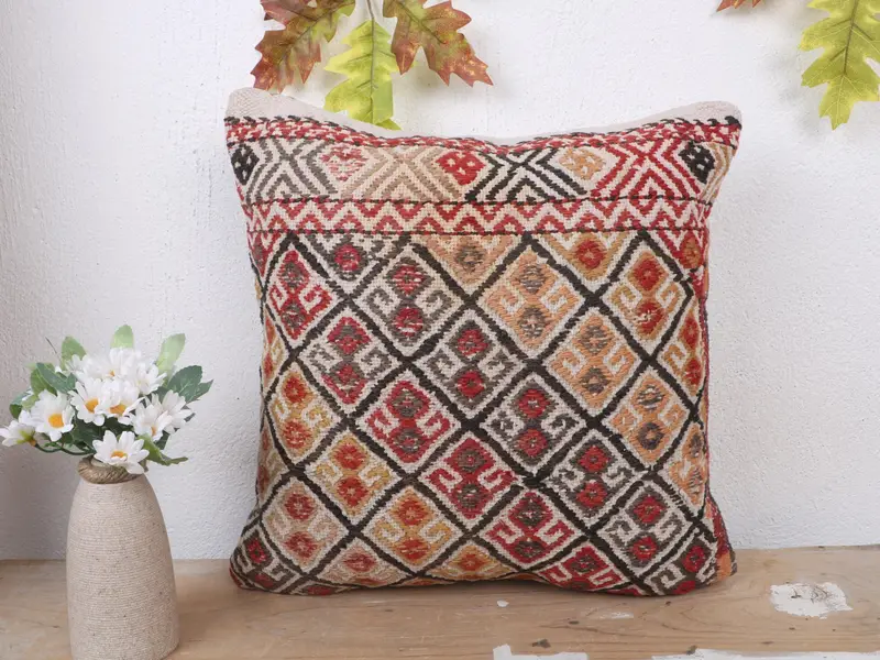 Red & Brown Patchwork Throw Pillow, 16x16 Embroidered Cushion