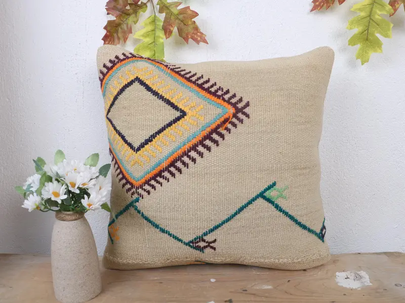 Embroidered Beige & Yellow Throw Pillow, Handmade Geometric Cushion