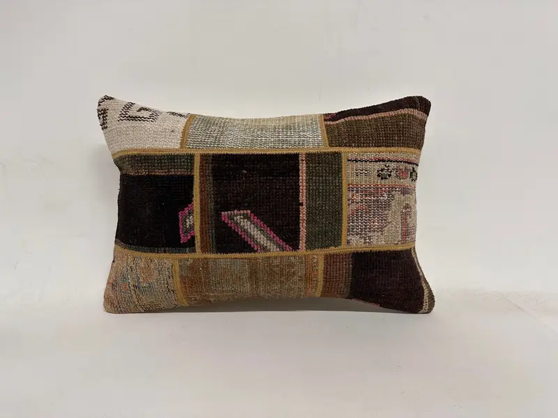 Embroidered Brown & Beige Patchwork Pillow, 16x24 Handmade Throw Pillow