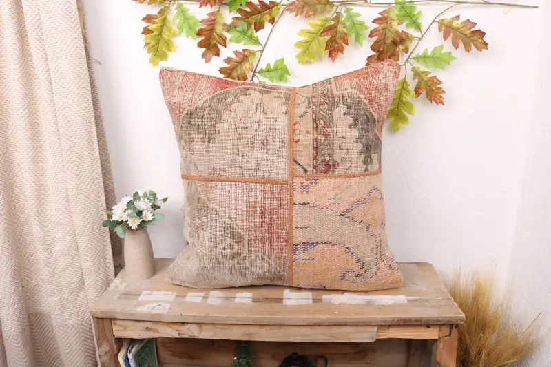 Orange & Beige Patchwork Throw Pillow, 22x22 Embroidered Vintage Pillow