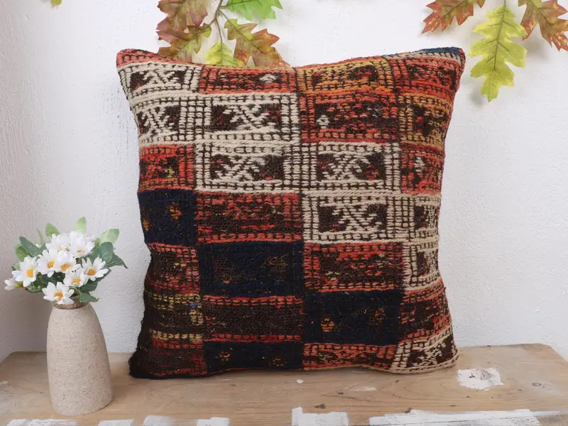 Green & Brown Geometric Throw Pillow, Vintage Embroidered Cushion