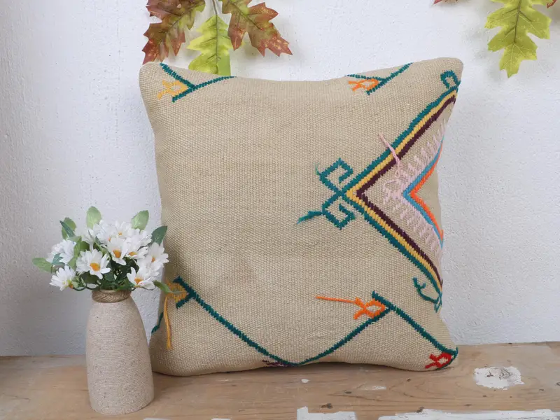 Beige & Green Embroidered Throw Pillow, Handmade Geometric Cushion