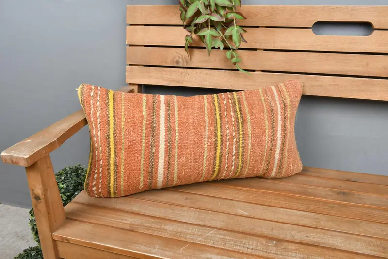 Orange & Green Striped Throw Pillow, Handmade Embroidered Cushion