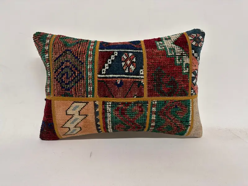 Brown & Orange Patchwork Throw Pillow, Handmade Embroidered Cushion