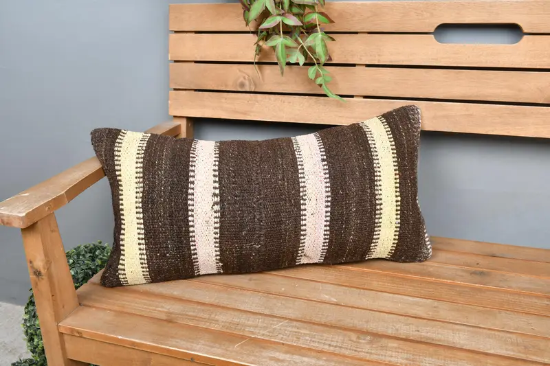 Brown & Beige Striped Throw Pillow, Handmade Embroidered Pillow