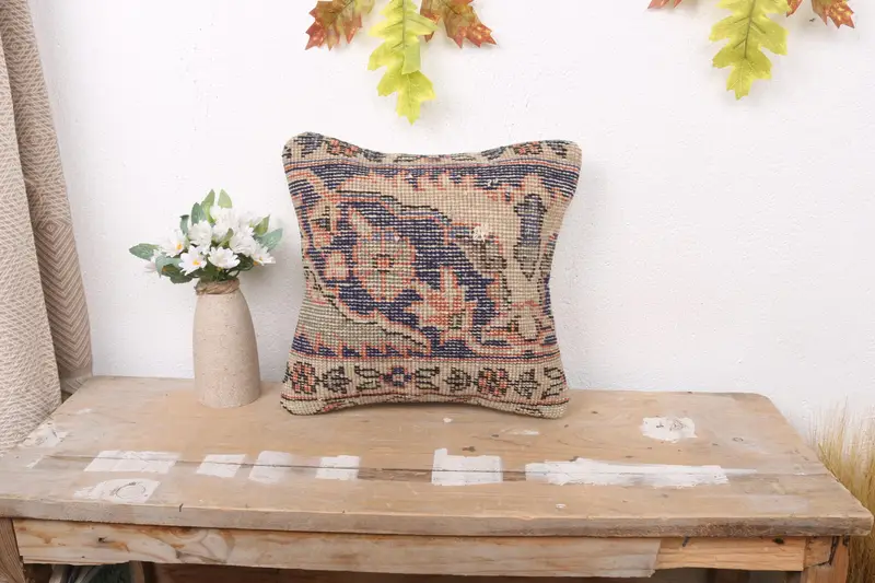 Handcrafted Blue & Green Floral Throw Pillow, 12x12 Vintage Cushion