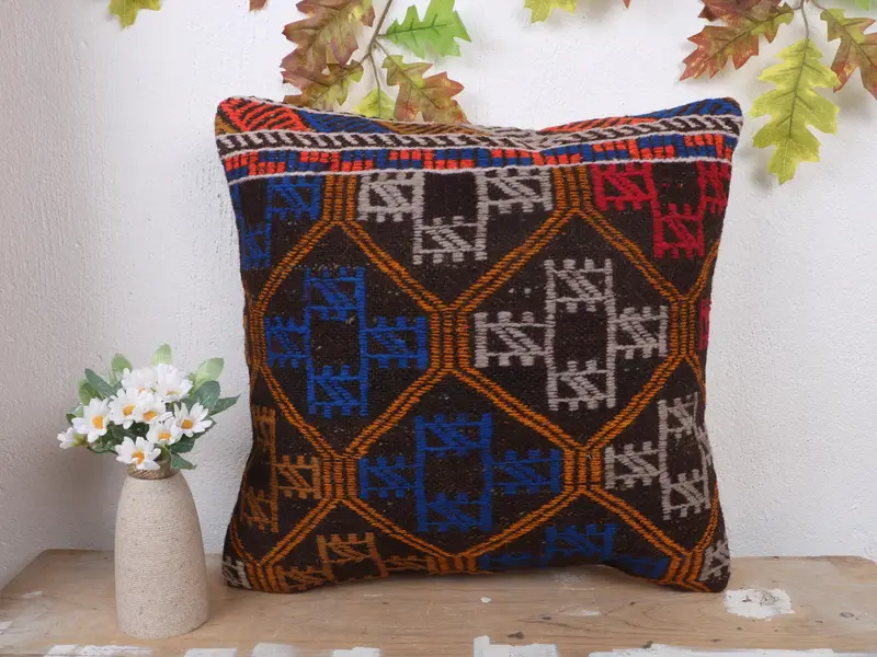 Blue & Brown Embroidered Geometric Throw Pillow, Handmade Linen Cushion